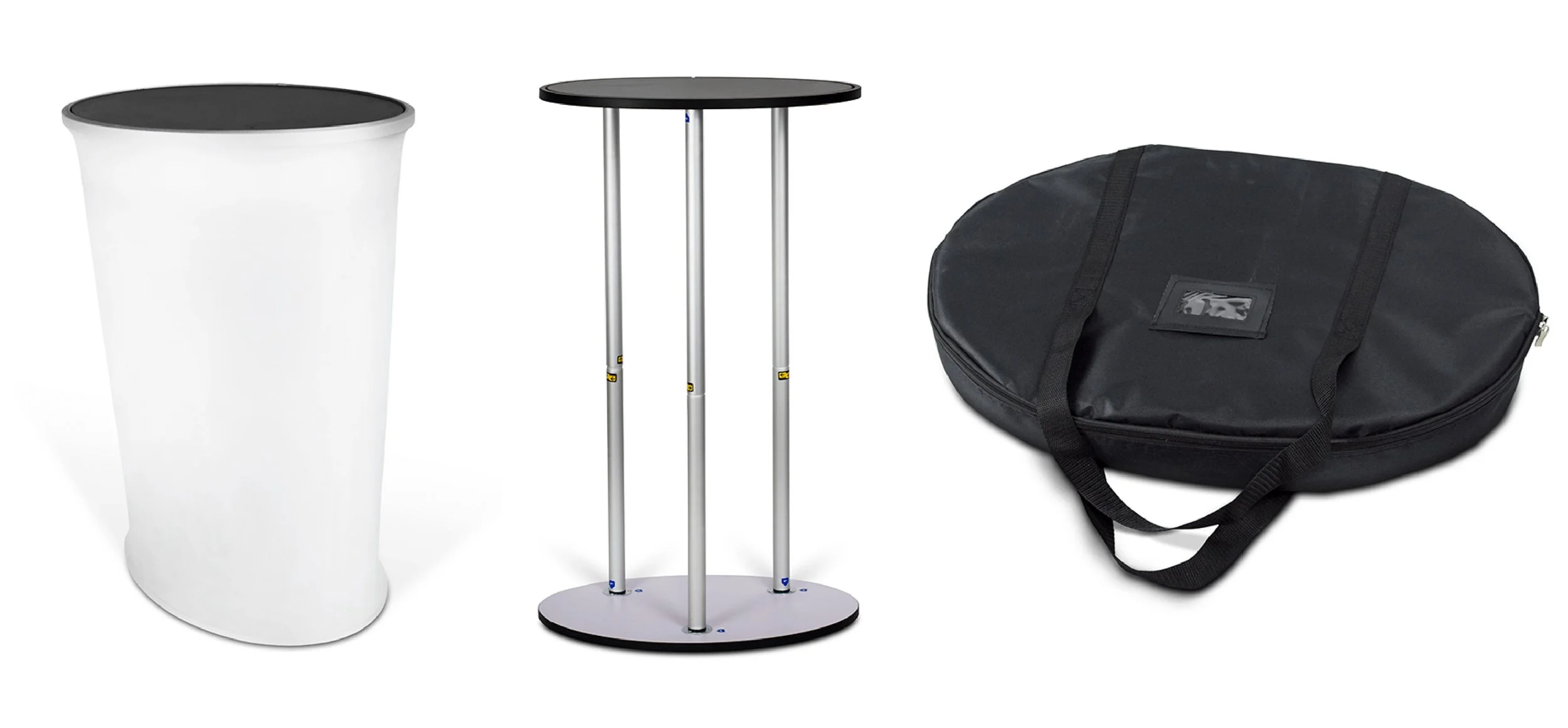 Oválný prezentační stolek s textilním potahem o rozměru 150×105 cm. Deska 60×40 cm, výška 100 cm, hmotnost cca 8 kg. Konstrukce je plně rozložitelná a složí se během několika sekund. Součástí je transportní taška pro snadný přenos.
