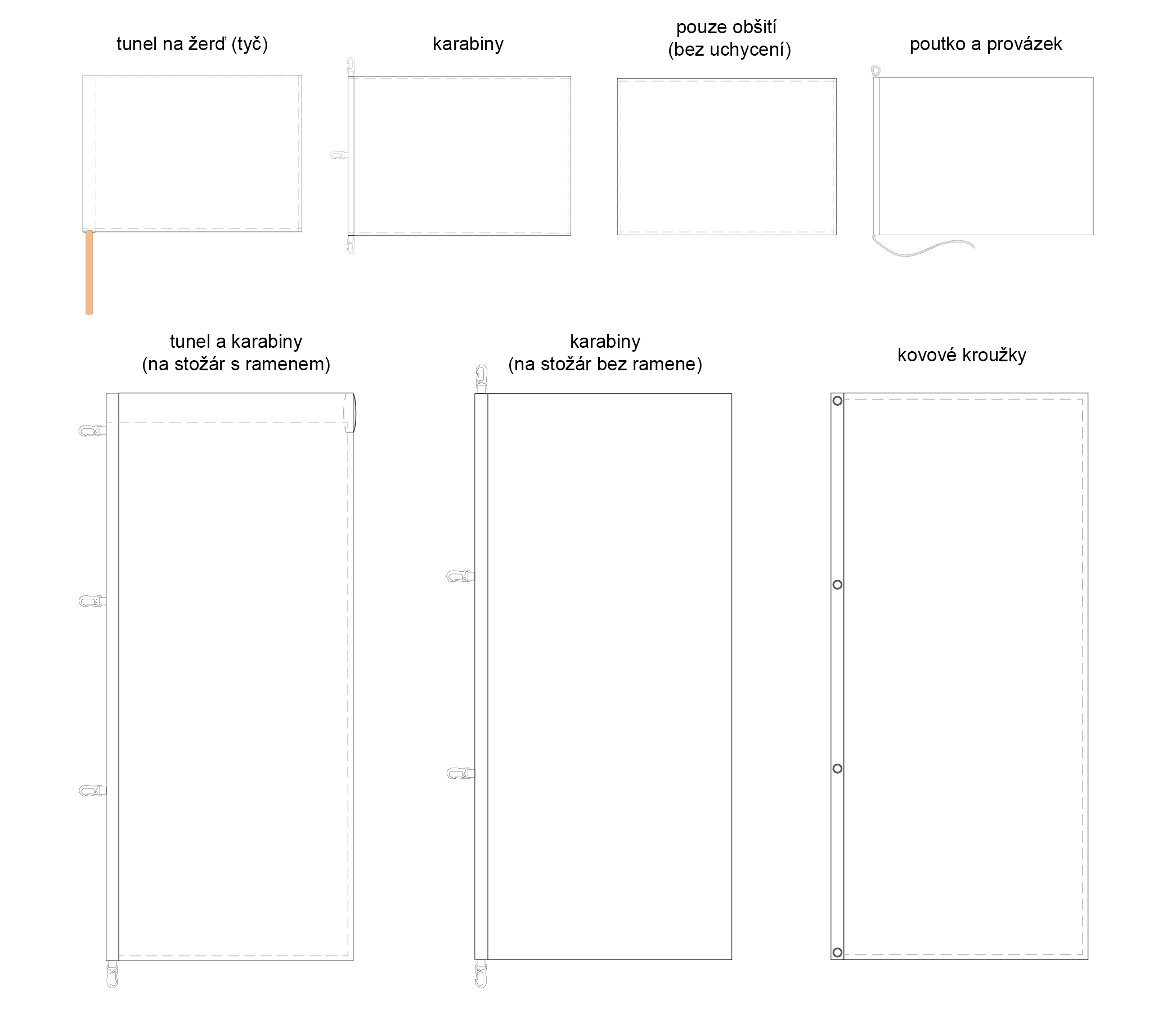 Způsob uchycení, neboli šití konfekce je finální fází výroby vlajek a poctivou ruční prací našich švadlen. I zde platí libovolný výběr zákazníka.